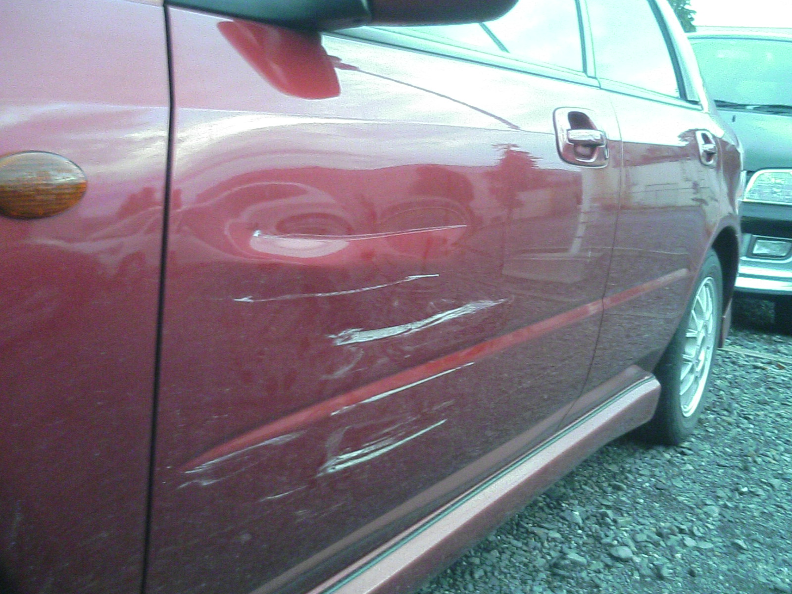 左隣に、頭から駐車してた車がバックで出て行く際にハンドルを右に切ってたんで、オイラの車の助手席ドアがボコボコに・・・