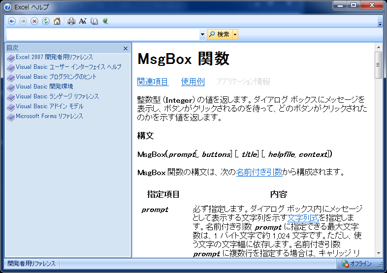 例えば Excel の VB Editor で "MsgBox" を選択して [F1] を押してみる。