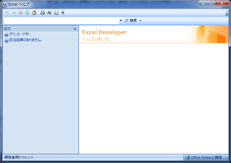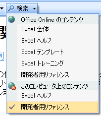 そんで検索方法の部分は "Office Online のコンテンツ" の "開発者用リファレンス" が選択されてます。