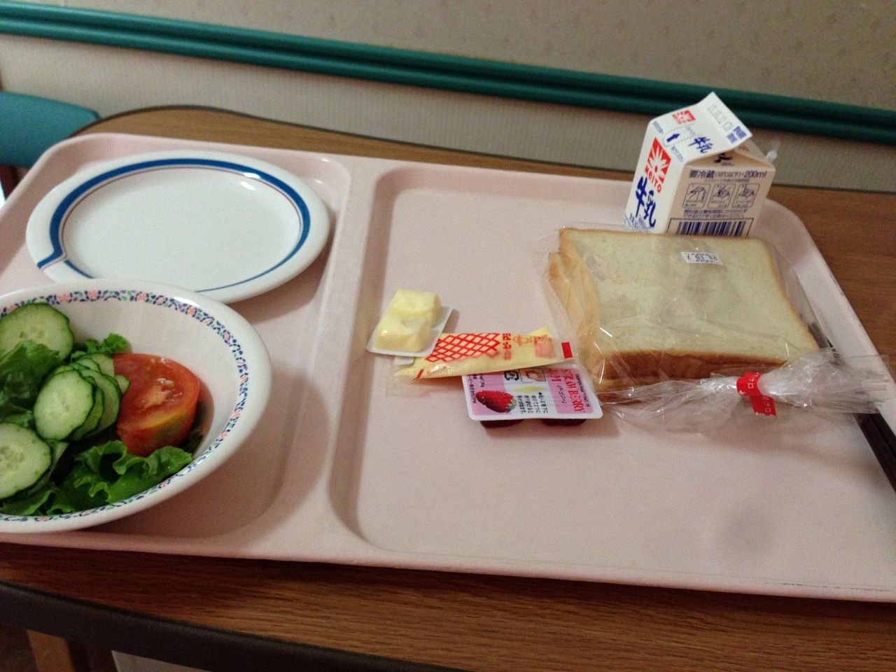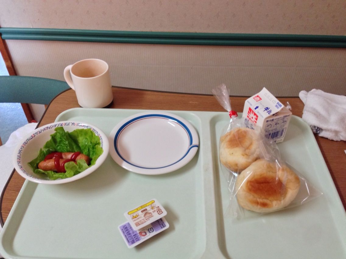 October 05, 2013 今日の朝メシね ロールパン 2個、サラダ、牛乳ね。 パンにはマーガリンとブルーベリー ジャム、サラダはハムが 2枚と葉っぱが 1枚ね。 おそらく 12時までもたないね。 9階行ってみる? それとも優寿司に脱走する? タグ :#入院中